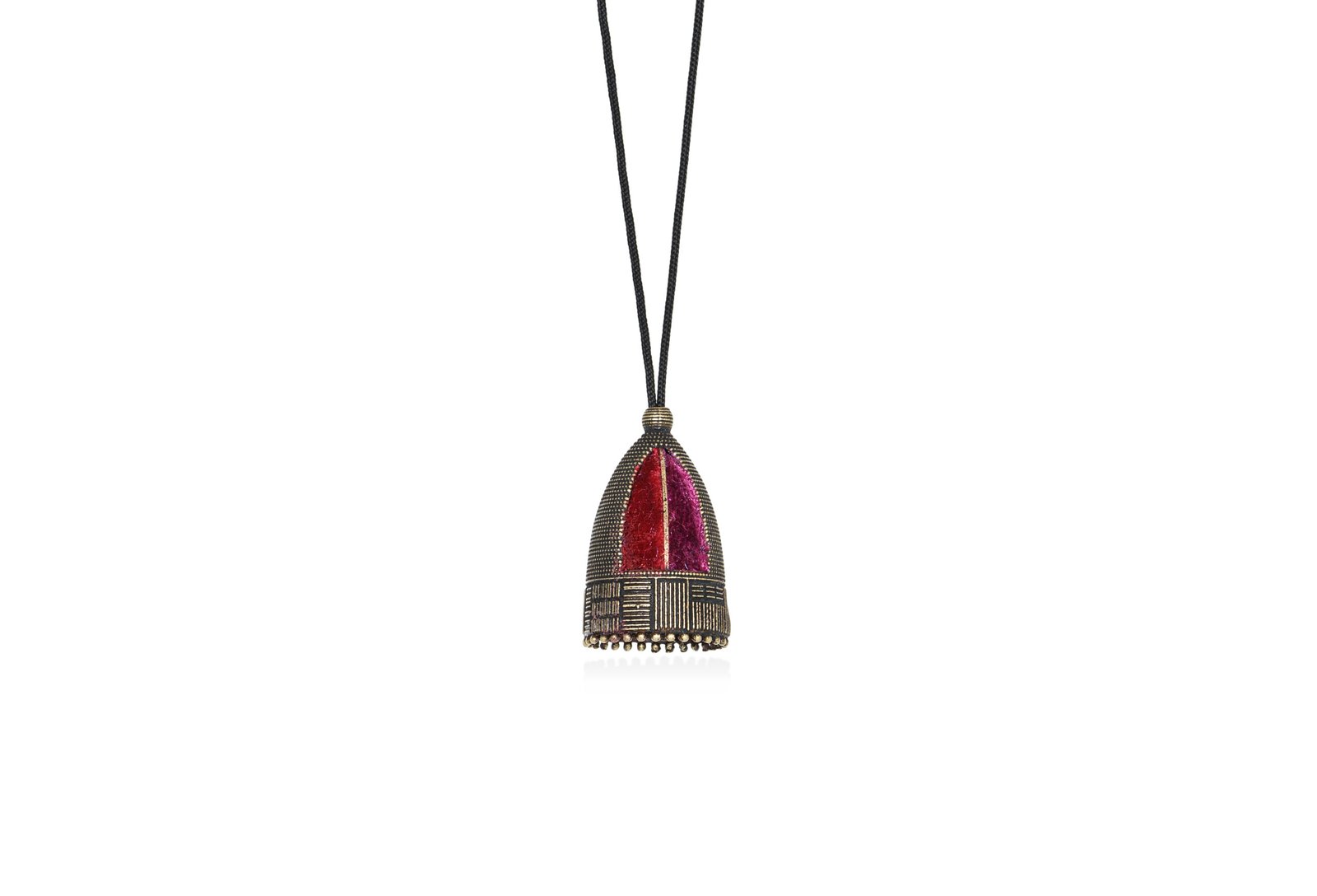 Χειροποίητο κολιέ σε σχήμα Δαχτυλήθρας, από οξειδωμένο μπρούτζο και κόκκινο και φούξια βελούδo στις δυο πλευρές.